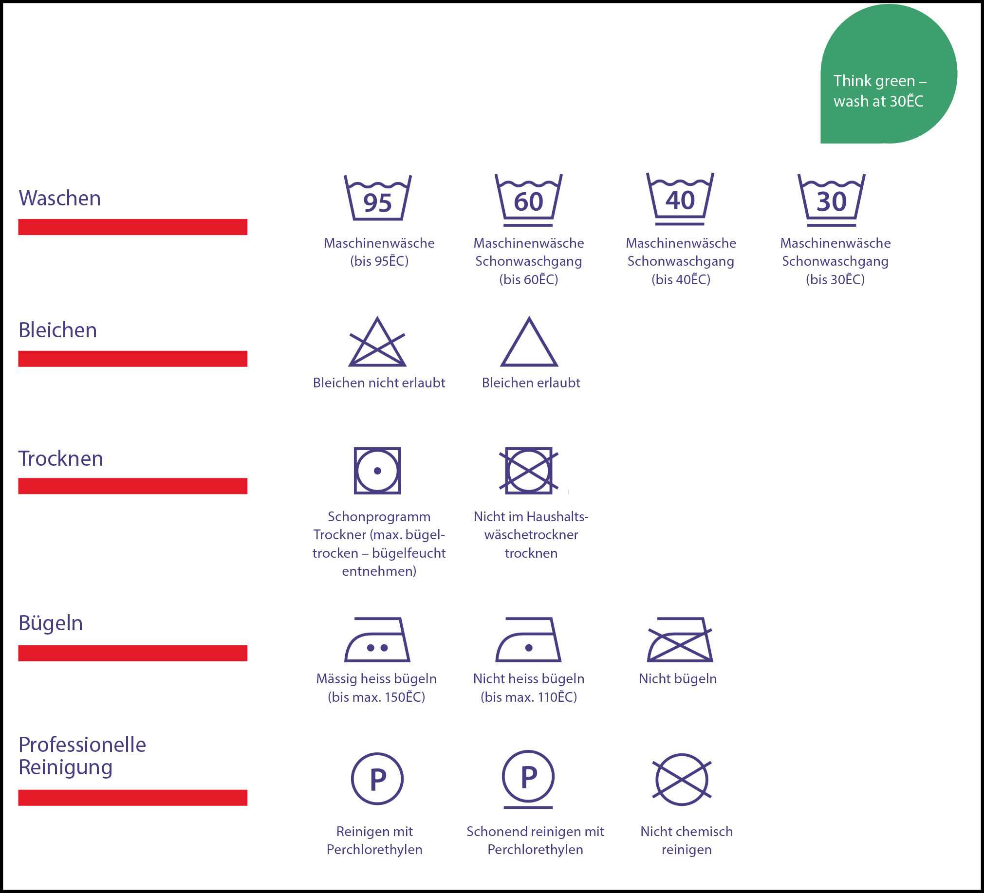 Die Textilwäsche ist ein Vorgang, bei dem zahlreiche physikalische und chemische Einflüsse zusammenwirken. Vier Faktoren beeinflussen den Prozess: die Chemie, die vom Waschmittel bestimmt wird, die Mechanik der Waschmaschine sowie die Zeit und die Temperatur, die von der Wahl des Wasch- und Trockenprogramms abhängen. Der Wascherfolg wird durch die Summe dieser vier Einflussfaktoren bestimmt. Unsere Produzenten haben diese Faktoren und ihre Auswirkungen auf unsere Produkte im Vorfeld untersucht und empfehlen, die auf dem Innenlabel vermerkten Wasch- und Pflegehinweise sorgfältig zu berücksichtigen. Waschmittel sind heute bereits sehr konzentriert: Es braucht kleine Mengen für eine erfolgreiche Wäsche. Wenn Sie Textilien mit mehreren Farben im gleichen Gang waschen, empfiehlt es sich, ein Buntwaschmittel zu benutzen. Diese sind eher mild und die Farben bleiben lange leuchtend. Bei Weisswaschmitteln ist Vorsicht geboten, sie beinhalten oft Bleichmittel und dem Kontrasteinsatz Ihres Textils droht der Entzug der Farbe.
