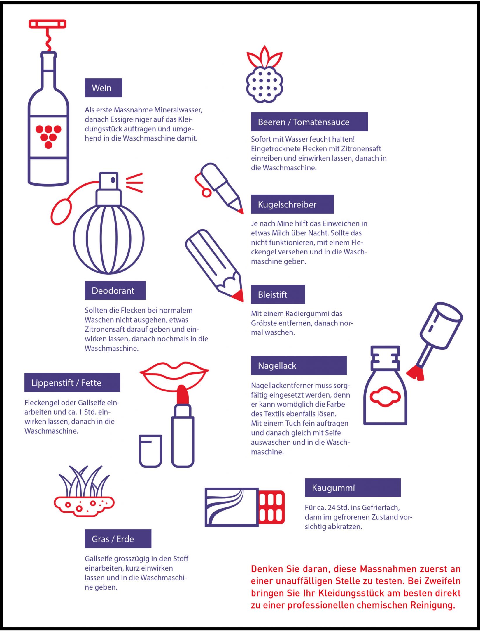 Damit jedes der von uns gelieferten Kleidungsstücke in Topform bleibt und Ihnen beim Reinigen möglichst wenig Aufwand verursacht, geben wir Ihnen gerne ein paar Wasch- und Pflegetipps weiter, dazu Nützliches und Wissenswertes zum Thema Fleckenentfernung.