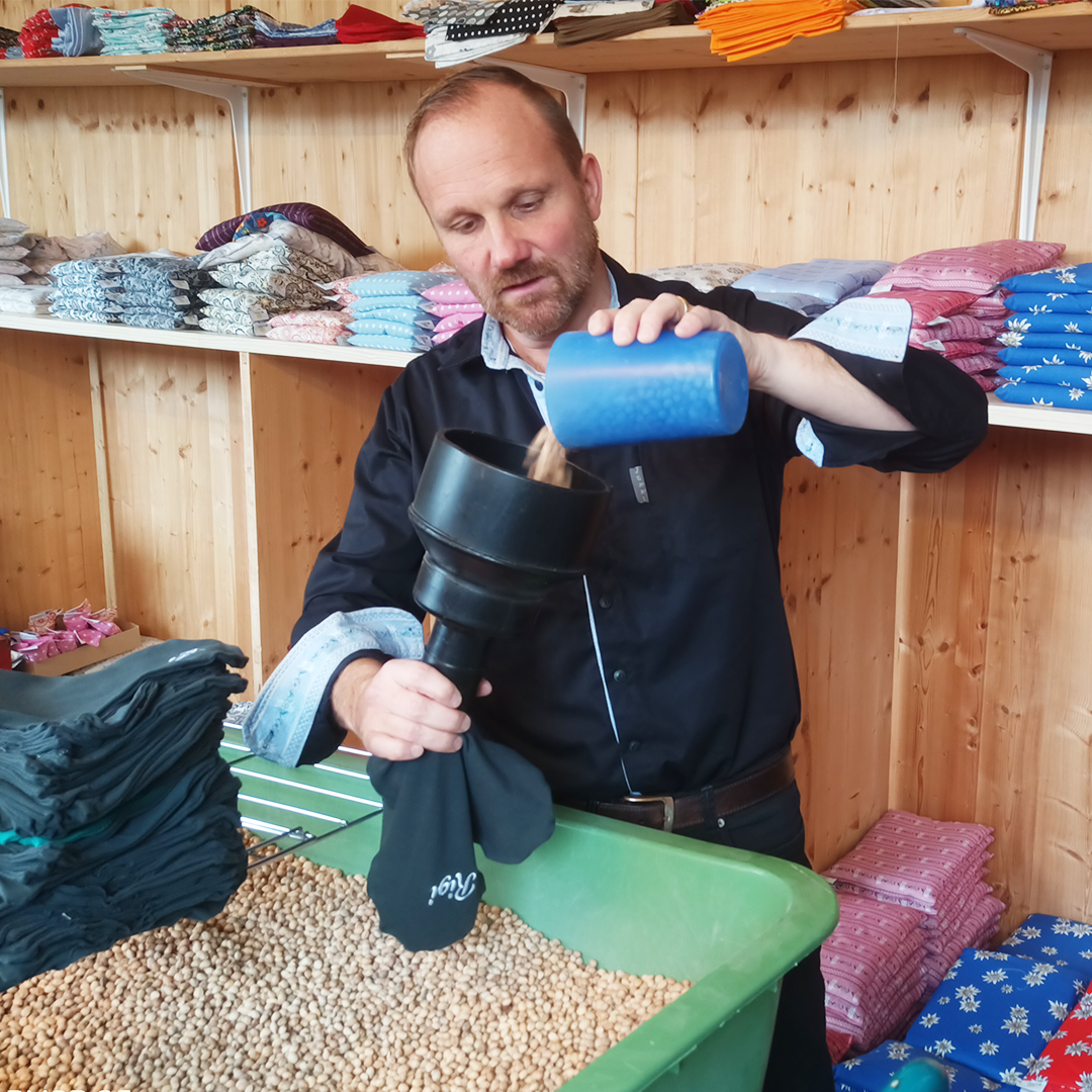 Mit einem Schweizer Produktionspartner wurden aus grünen und anthrazitfarbenen Poloshirts feinduftende Lavendelsäckli und wärmende Kirschstein-Herzen hergestellt.