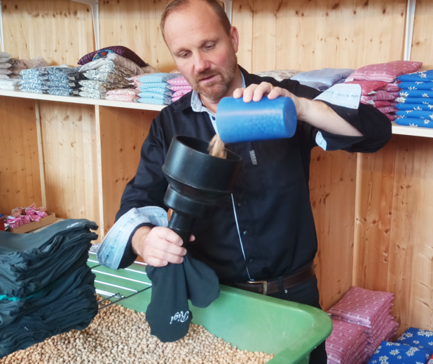 Mit einem Schweizer Produktionspartner wurden aus grünen und anthrazitfarbenen Poloshirts feinduftende Lavendelsäckli und wärmende Kirschstein-Herzen hergestellt.