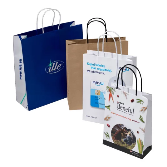 Tragtasche aus Kraftpapier 160 g/m2 (weiss oder braun lieferbar) mit Schutzlack, mit gedrehten Papierkordeln, verstärktem Randumschlag und eingelegtem Bodenkarton, auch in jeder anderen Grösse erhältlich (Preise auf Anfrage), Mindestbestellmenge 1000 Stück