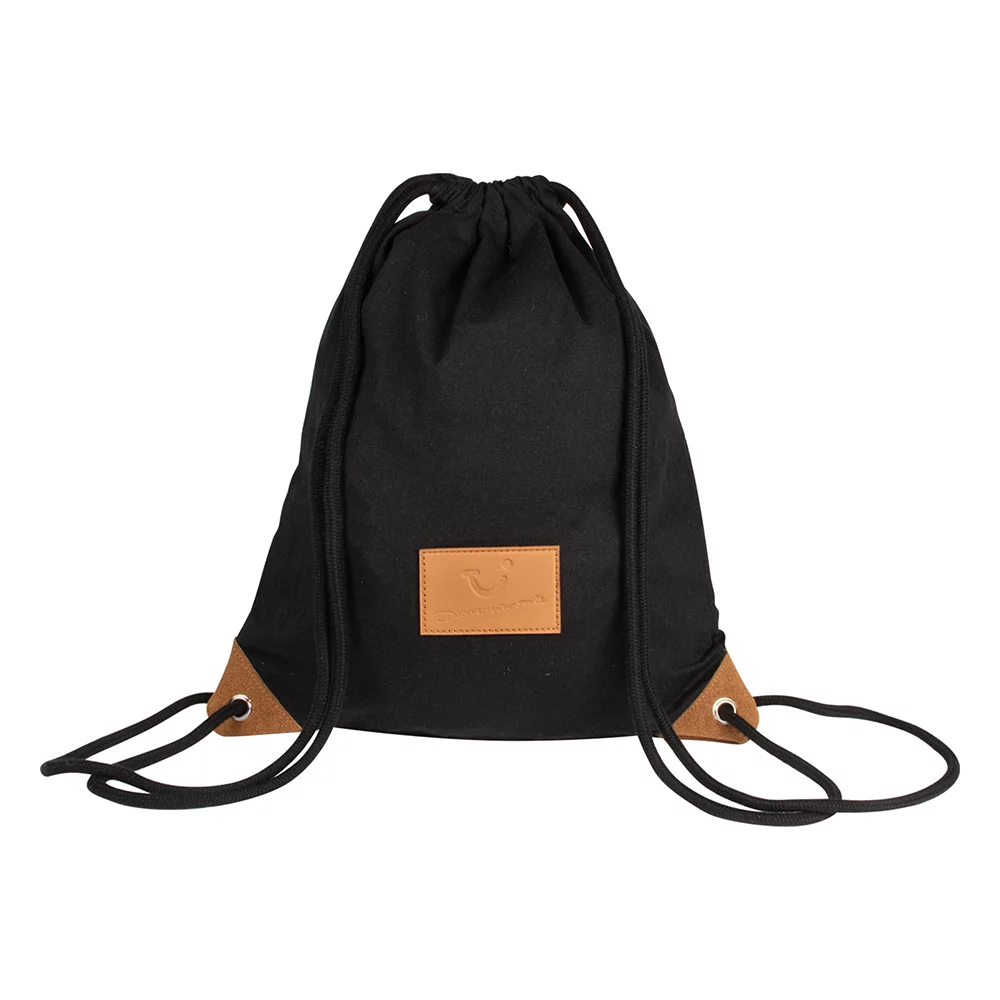Trendige Tasche aus Baumwolle 225 g/m² (8 ozs), Kordelzüge dienen gleichzeitig als Umhängegurte, untere Enden mit Metallösen und Kunstlederecken verstärkt, Mindestbestellmenge 250 Stück