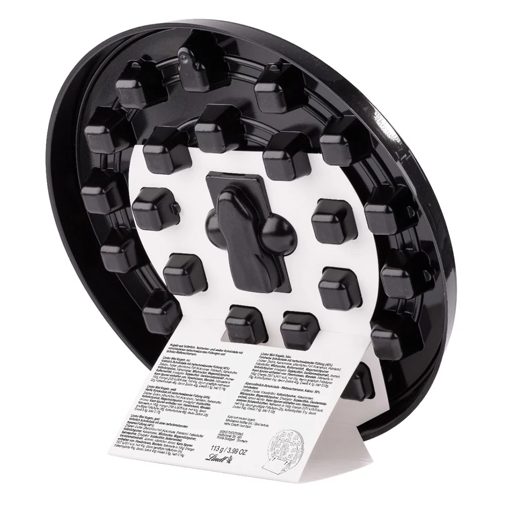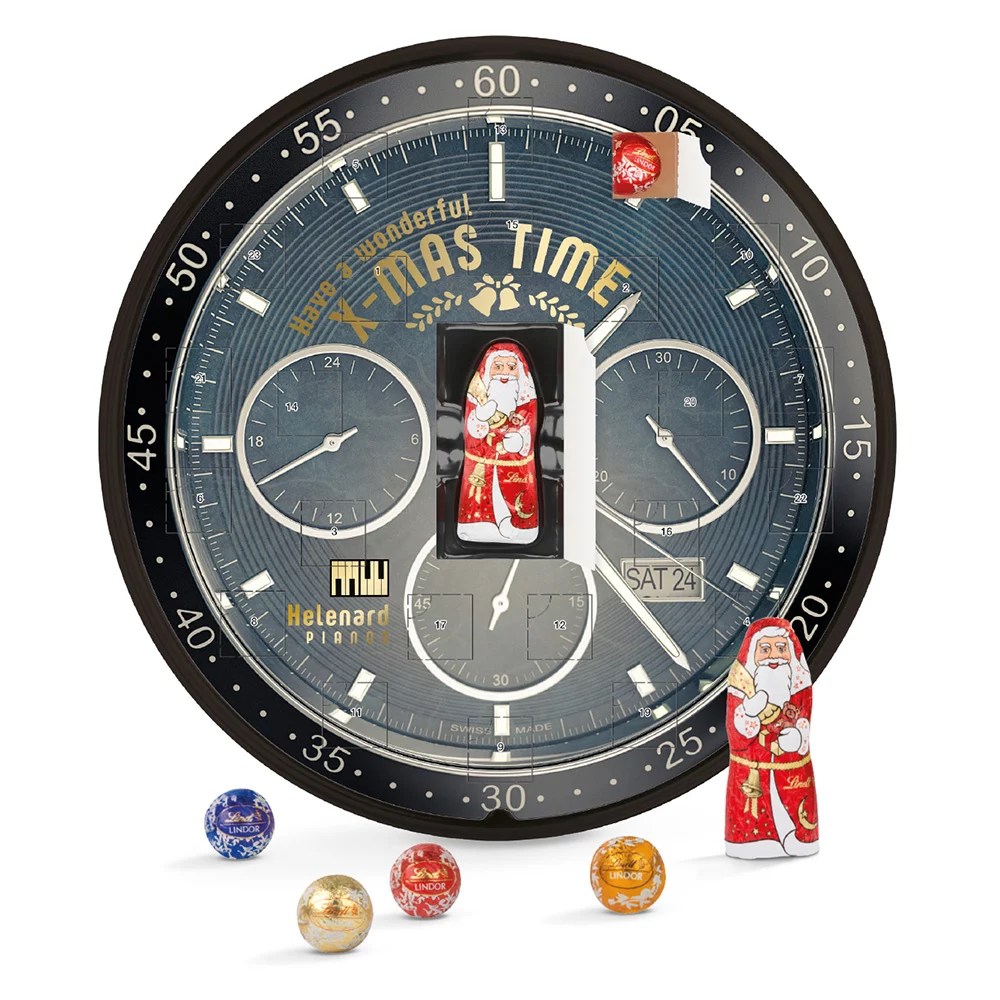 Origineller Adventskalender befüllt mit 23 Stück (113 g) bunt gemischter, feinster Lindor Mini-Kugeln (Weiss, Dunkel, Milch und Caramel) und 1 Lindt-Weihnachtsmann (10 g) Vollmilchschokolade aus dem Hause Lindt & Sprüngli, mit Aufhänger und ausklappbarem Tischaufsteller am Rückenteil, Rahmen nach Wahl in Schwarz oder Chromglanz, individuell bedruckbar auf der Frontseite, Haltbarkeit ca.