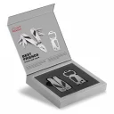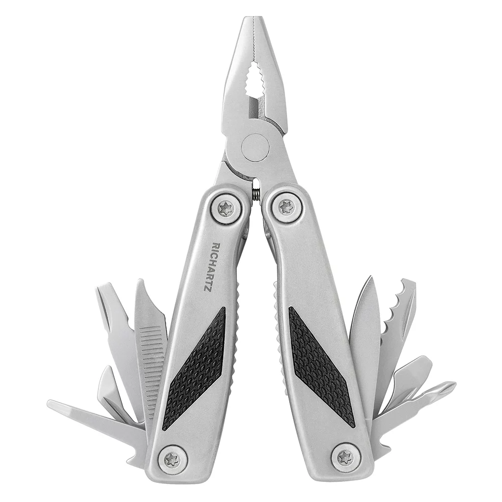 Set bestehend aus einem kleinen, präzisen Multifunktionstool aus rostfreiem Edelstahl mit 14 Funktionen; Zange mit Drahtschneider, zwei Klingen (eine mit Wellenschliff), zwei Schlitzschraubendreher, eine Schlitzschraubendreher-/Kapselheberkombination, Kreuzschlitzschraubendreher, Dosenöffner, Feile, Gürteltasche und zwei im Griff integrierte Sechskantschlüssel, sowie einem weiteren unentbehrlichen Tool aus rostfreiem Edelstahl für den Schlüsselbund, mit 16 Funktionen; Kapselheber, kleiner und grosser Schlitzschraubendreher, Kreuzschraubendreher, Kabelabzieher, zwei Fahrradspeichenschlüssel, sieben Sechskantschlüssel, Zentimetermass und Nagelzieher, wird in schöner Geschenksbox geliefert