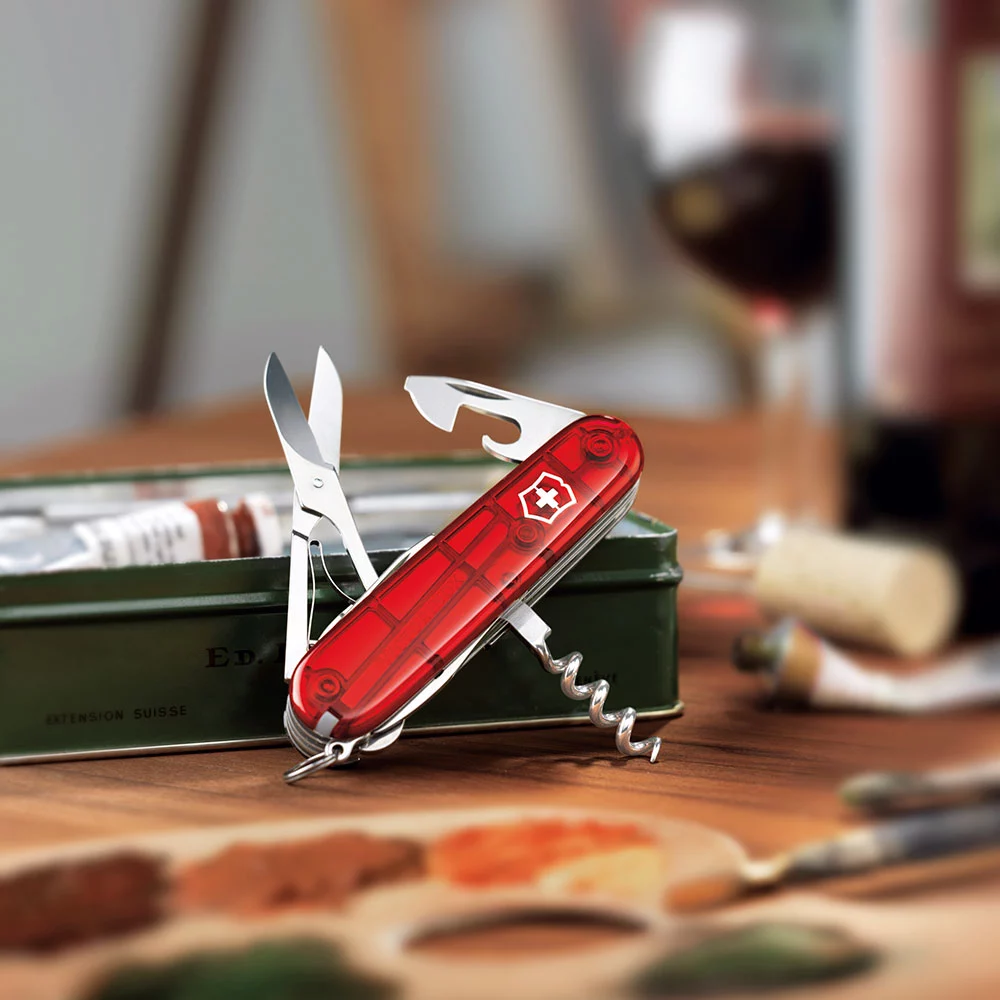 Der ideale Begleiter für jeden Outdoor-Trip! Multifunktionales Taschenmesser aus dem Hause Victorinox, aus hochwertigem, rostfreiem Stahl mit 14 Funktionen: grosse Klinge, kleine Klinge, Schere, Dosenöffner mit kleinem Schraubendreher, Korkenzieher, Stech-Bohr-Nähahle, Zahnstocher, Pinzette, Mehrzweckhaken (Paketträger), Kapselheber mit Schraubabdreher, Drahtabisolierer und Ring (Anhänger)