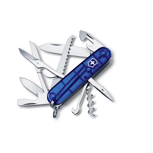 Campingplatz oder Wald - das sind seine Reviere! "Offiziersmesser" aus dem Hause Victorinox, aus hochwertigem, rostfreiem Stahl mit 15 Funktionen; grosse und kleine Klinge, Schere, Dosenöffner mit kleinem Schraubendreher, Korkenzieher, Holzsäge, Stech-Bohr-Nähahle, Zahnstocher, Pinzette, Mehrzweckhaken (Paketträger), Kapselheber mit Schraubendreher, Drahtabisolierer und Ring (Anhänger)
