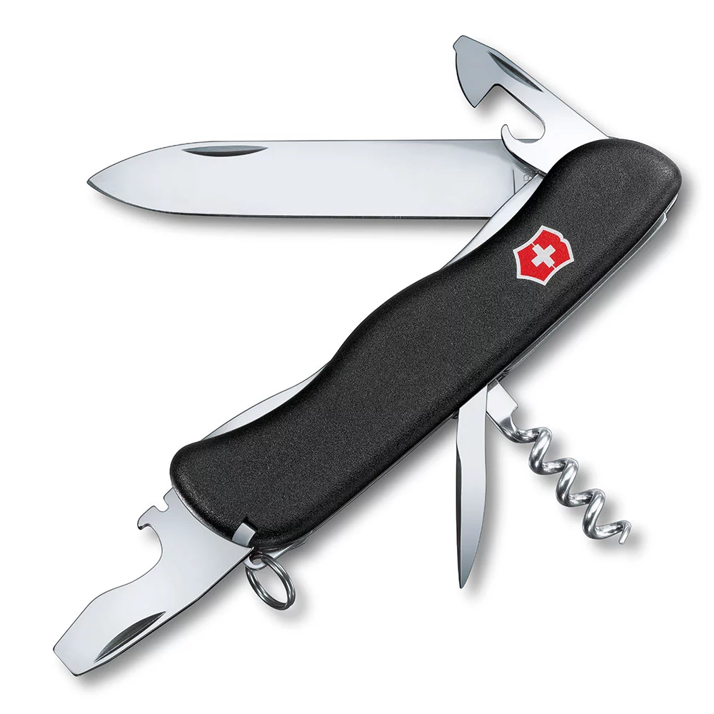 Taschenmesser in elegantem Design und aus hochwertigem, rostfreiem Stahl aus dem Hause Victorinox, mit 11 Funktionen: Dosenöffner, 2 Schraubendreher, Korkenzieher, Stech-Bohr-Nähahle, Ring, Zahnstocher, Pinzette, Feststellklinge, Kapselheber, Drahtabisolierer