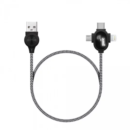 Hochwertiges 3-1 Ladekabel aus Nylon geflochten, ausgestattet mit Lightning-, Micro-USB-, Type-C- und USB-Anschluss, für alle Geräte einsetzbar, wird in Polybeutel geliefert, Mindestbestellmenge 500 Stück