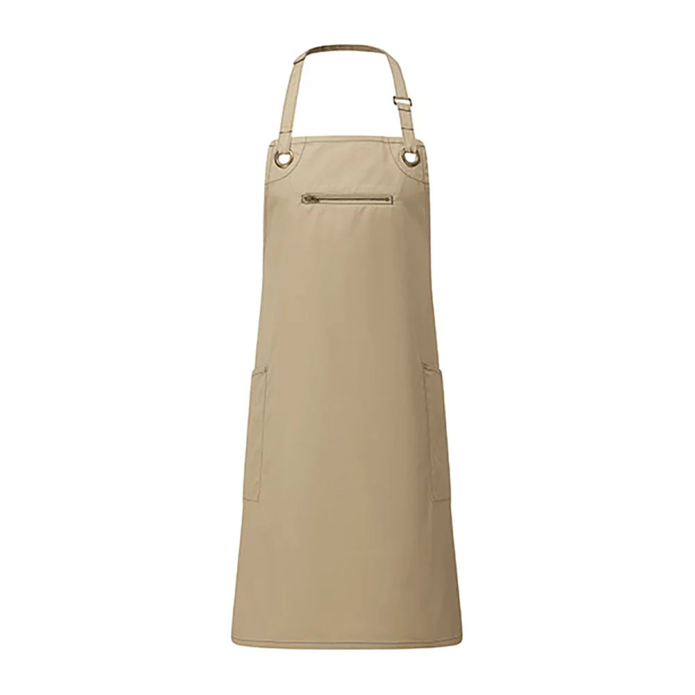 Nachhaltige Latzschürze mit kontrastfarbenem Einsatz und verstellbarem Band am Nacken.