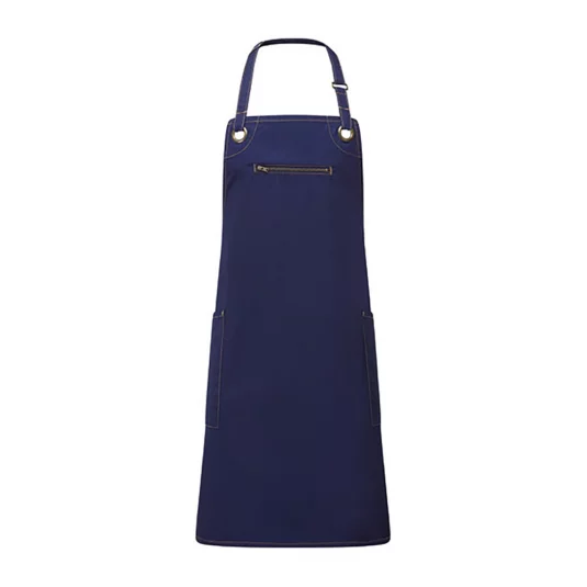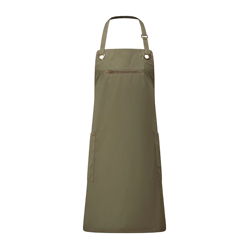 Nachhaltige Latzschürze mit kontrastfarbenem Einsatz und verstellbarem Band am Nacken. Mit zwei abgeschrägten Fronttaschen. Hergestellt aus Recyceltem Polyester aus Altkunststoff und Baumwolle.