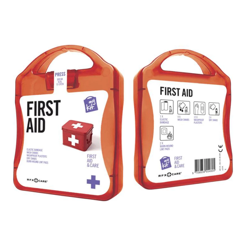 Praktische, kleine Notfall-Box aus gefrostetem Kunststoff, befüllt mit folgendem Inhalt: 12 wasserfeste Pflaster, 4 hautreinigende Tupfer, 2 Trockentupfer, 1 elastischer Verband, 2 Mullbinden für Brandwunden