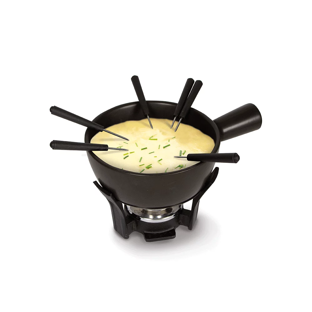 Hochwertiges Fondue-Set bestehend aus einer Keramikpfanne, mit Rechaud aus Edelstahl sowie 6 Fonduegabeln