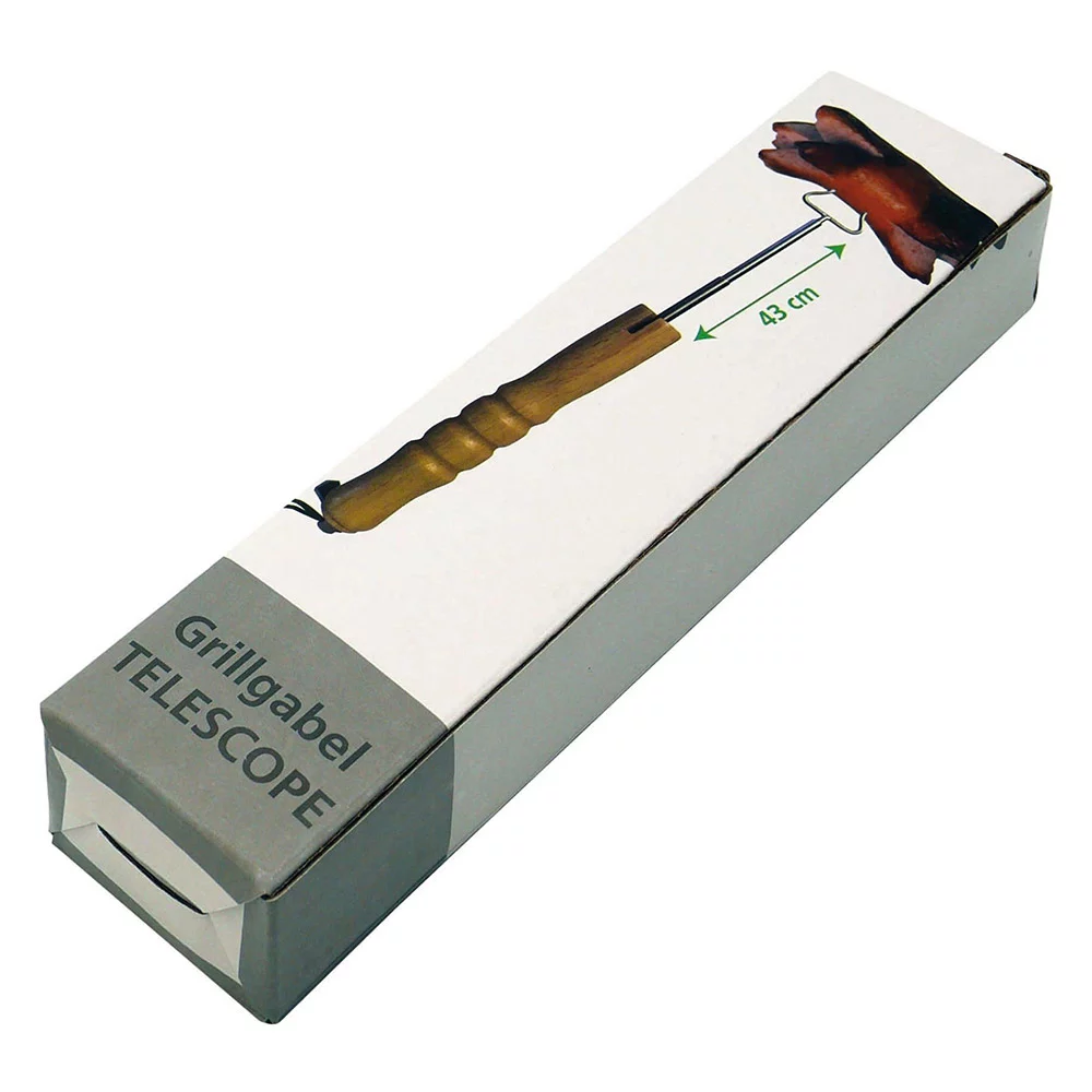 Praktische Grillgabel aus rostfreiem Edelstahl und Holz, mit komplett verstaubarem Spiess, robustem Griff mit Kapselheber und praktischem Lederbändel, wird in Etui geliefert