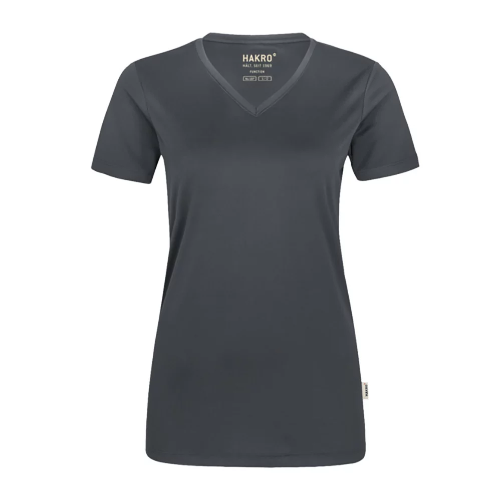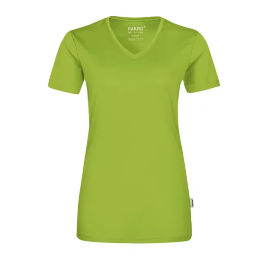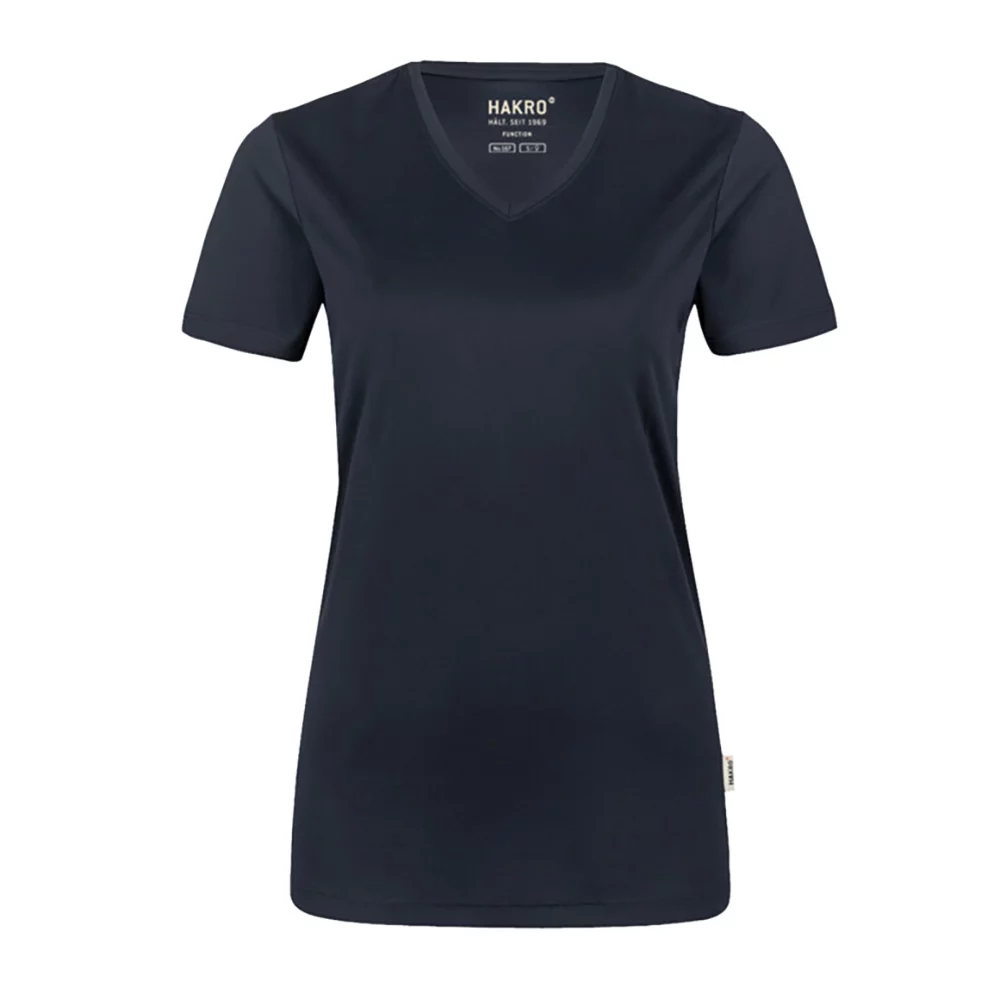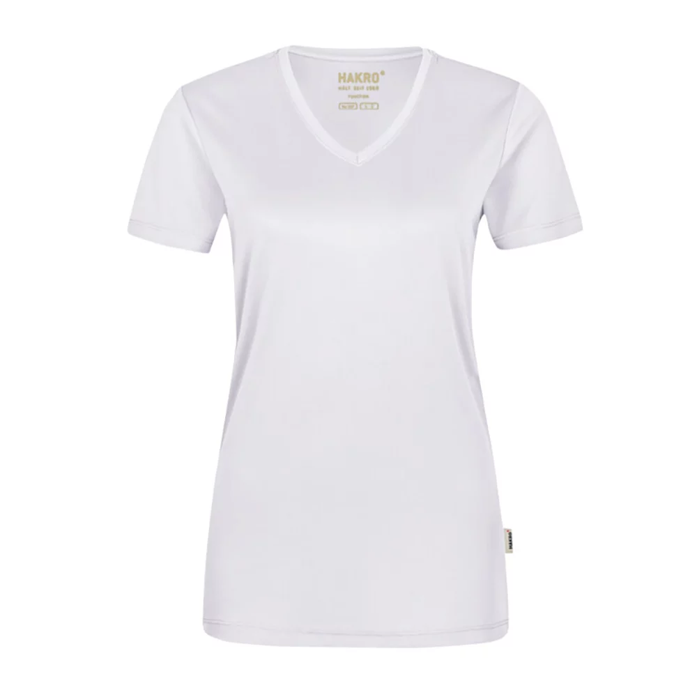 Funktionelles T-Shirt für Damen, mit feminin geschnittenem V-Ausschnitt, verlängertem, abgerundetem Rückenteil und Nackenband.