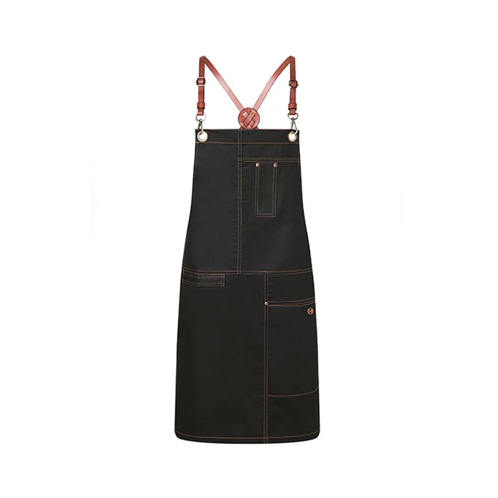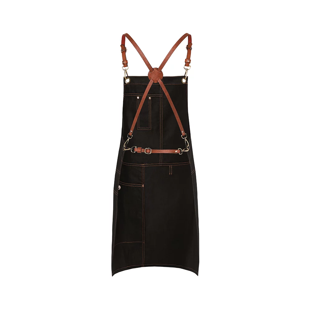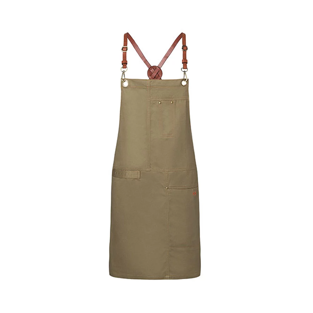 Stylisch-trendige Latzschürze in Twill-Optik mit Kreuzträgern zur Entlastung des Nackens. Einfaches Abnehmen und Befestigen aller Bänder mithilfe von Karabinerverschlüssen. Schnallen zum stufenlosen Einstellen der Länge. Zusätzliches Taillenband zum Regulieren der Weite garantiert einen festen Sitz. Bronzierte Nieten und kontrastfarbige Steppnähte sorgen für einen unverwechselbaren Urban-Style. Funktionale Bänder aus Echtleder, praktische Stoffschlaufe auf der rechten Seite zum Befestigen eines Kassierhalfters oder Geschirrtuchs, linksseitige Tasche (16 x 24 cm) und Stiftfach auf Brusthöhe.