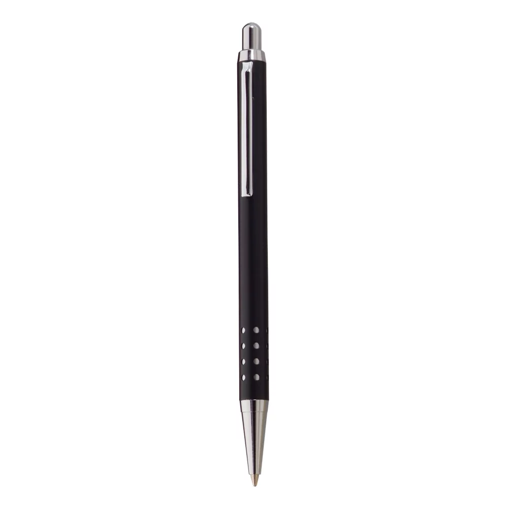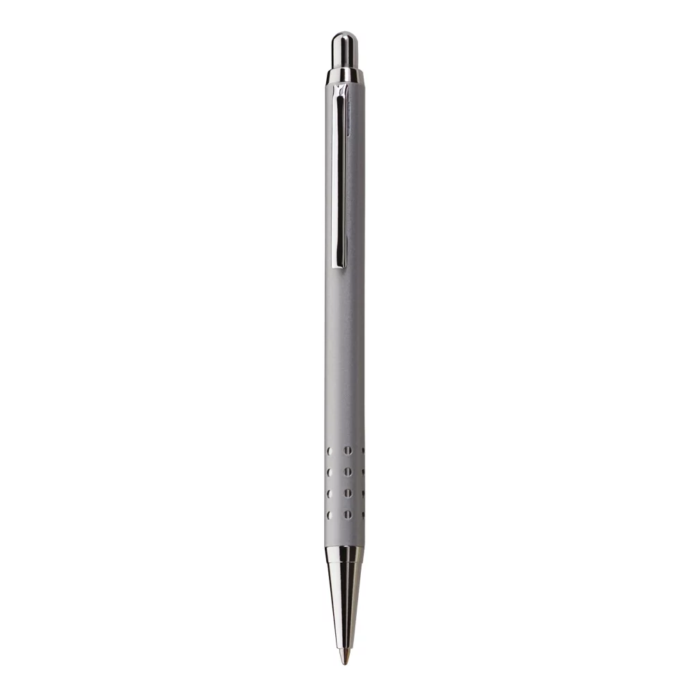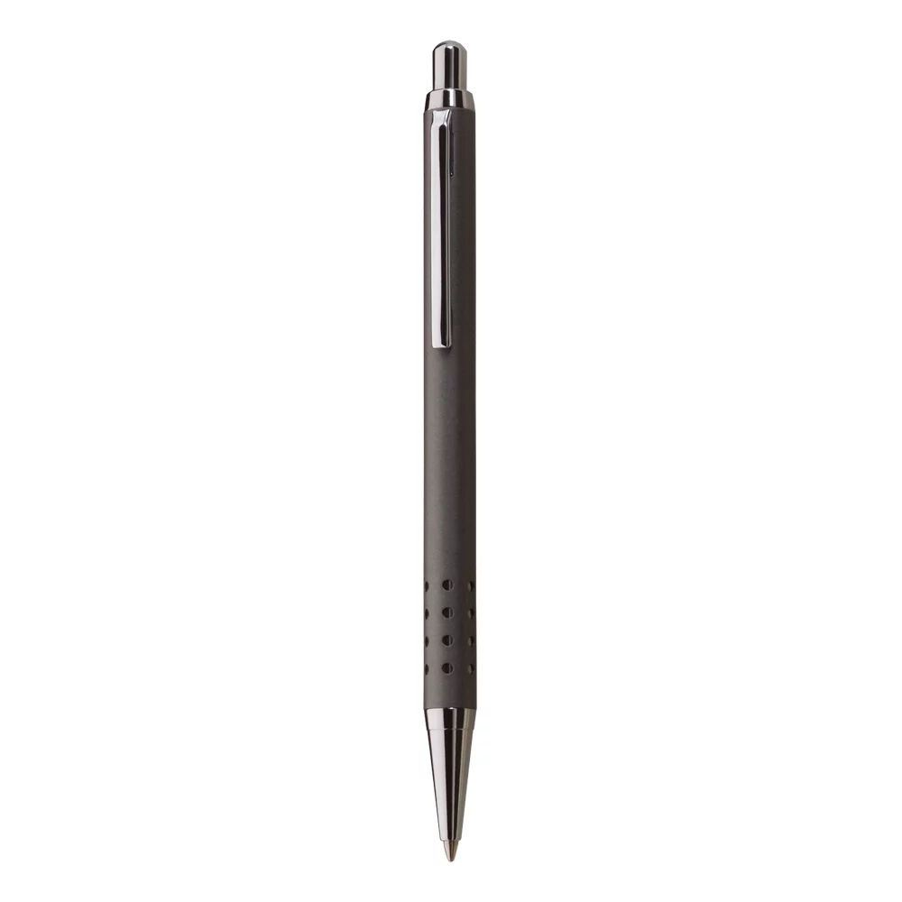 Elegantes, schlankes Schreibgerät im attraktiven Loch-Design mit glanzeloxiertem Metallgehäuse und Chrombeschlägen, mit Metall-Grossraummine (blau)