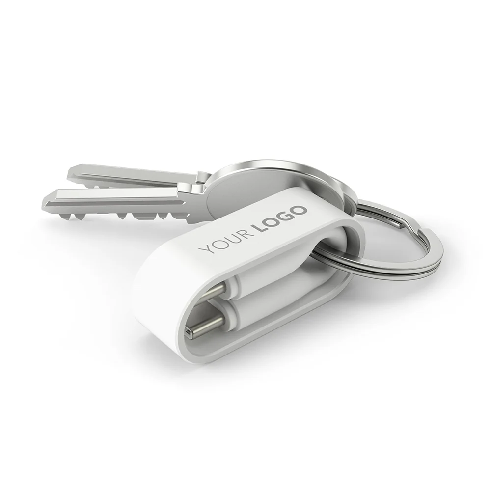 Kompaktes USB-C zu USB-C Schnellladekabel aus Kunststoff und rezykliertem Kupfer, mit Übertragungsgeschwindigkeit von 480 MBit/s, mit praktischer Schutzhülle und Schlüsselring