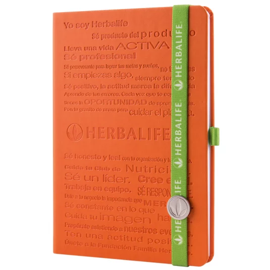 Originelles, individuell gestaltetes Notizbuch, Material Tucson, Elastikband und Stiftschlaufe in individueller Farbe (Pantone) mit Aufdruck, Lanybutton mit Geldoming, Blindprägung auf Deckel