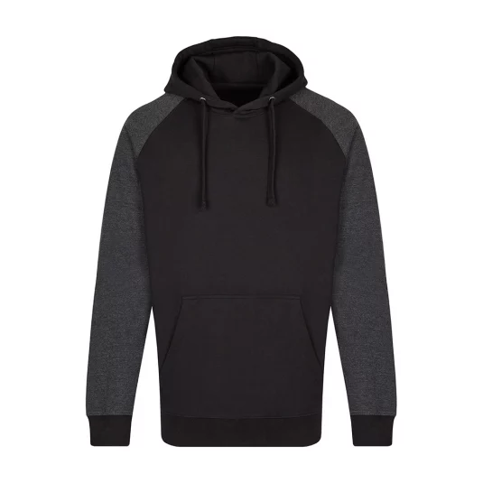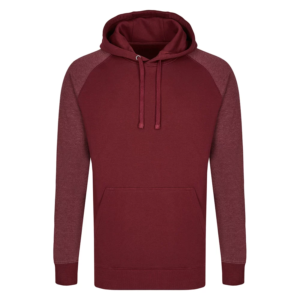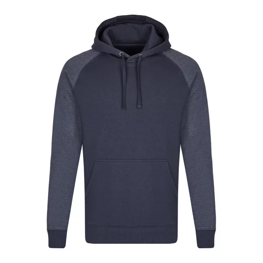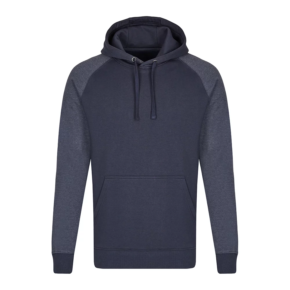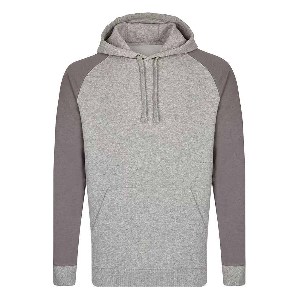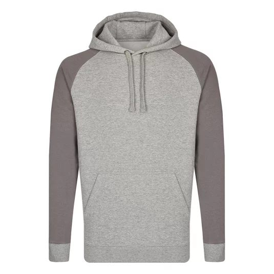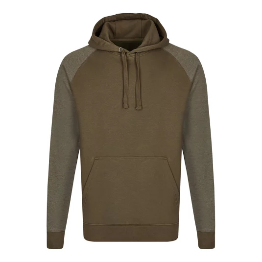 Moderner Hoody aus ringgesponnener Baumwolle, 3-teilige, doppellagige Kapuze für besseren Tragekomfort,  flache Kordel, Kängurutasche, Ärmelabschlüsse und Bund aus 2x1 Ripp-Strick und Raglan-Ärmel.