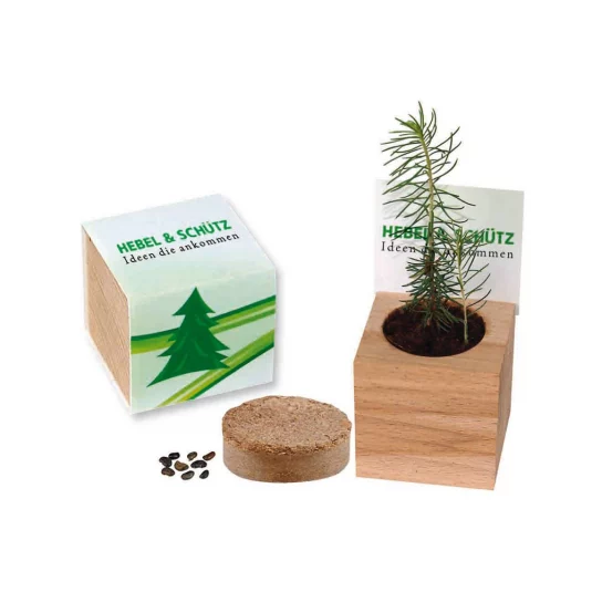 Origineller Weihnachtsbote der während der Adventszeit mitwächst! Holz-Würfel aus Buche wird direkt bepflanzt mit den beiliegenden Fichtensamen und der Erdtablette, mit Werbebanderole in Eigendesign, Haltbarkeit der Samen: mind. 3-4 Monate bei trockener Lagerung
