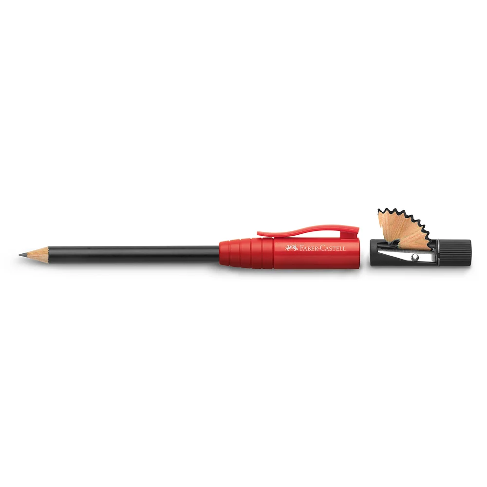 Der Alleskönner! Schwarz eingefärbter Bleistift aus Holz, mit Radiergummi und einer Kunststoffkappe (schwarz oder weiss) mit integriertem Spitzer, welche den Stift verlängert und gleichzeitig schützt, Härtegrad B