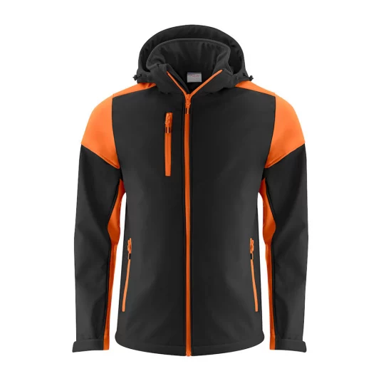 Zweifarbige Softshell Jacke mit abnehmbarer Kapuze.