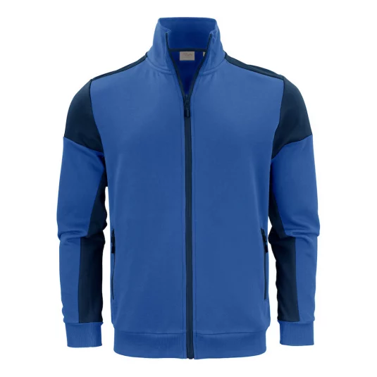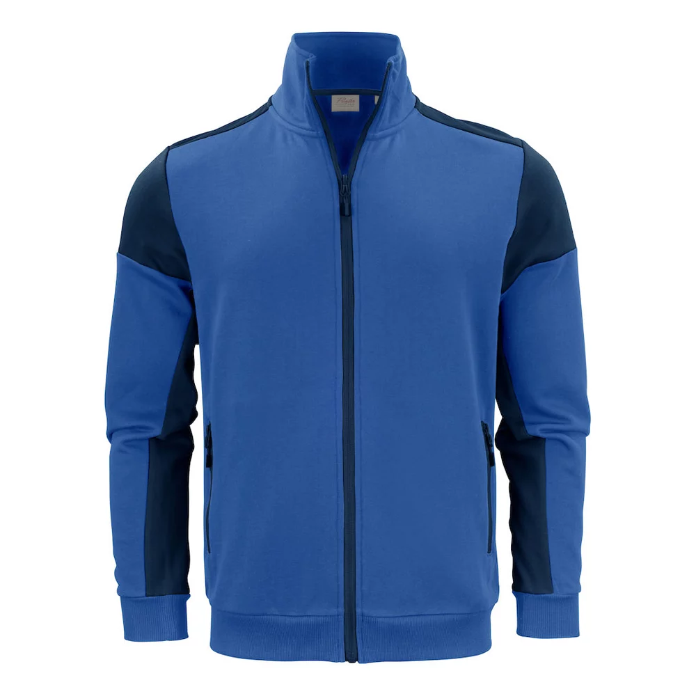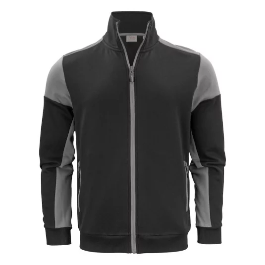 Zweifarbige Sweatjacke mit Stehkragen und durchgehendem, kontrastfarbigem Reissverschluss vorne und an den Seitentaschen.
