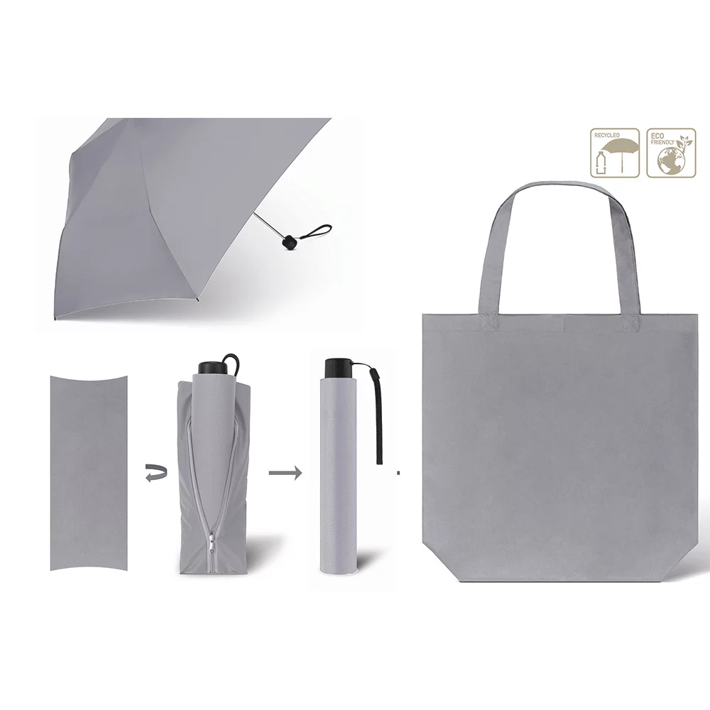 2in1 - nachhaltiger, robuster Mini-Schirm mit praktischer Reissverschluss-Hülle, welche jederzeit zu einer Einkaufstasche umgewandelt werden kann, mit praktischem Schirmfach zum trockenen und sicheren Verstauen des nassen Schirms, beides aus hochwertigem Polyester Pongee aus rezykliertem Material, mit stabilem Stahlgestell mit Windproof-Funktion