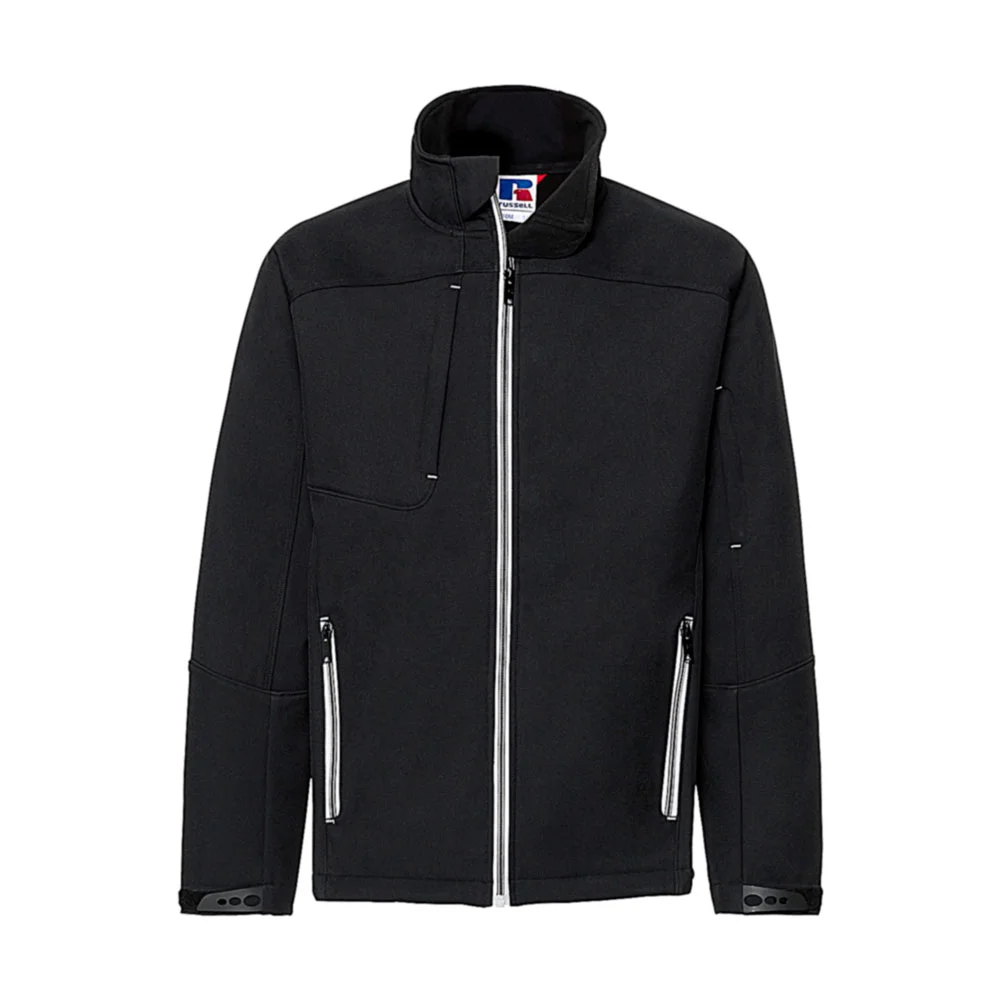 Bionic-Finish® Eco (3-lagige Softshell mit hydrophober Membran), Fluor und PFC frei, Wind- und wasserdicht (5000 mm), Atmungsaktiv (5000 g/m² in 24h), Stehkragen, Hydroshell Air Einsätze im Achselbereich, Brust-, Arm- und Seitentaschen mit Zip, Media-Netztasche innen, verstellbare Ärmelbündchen.