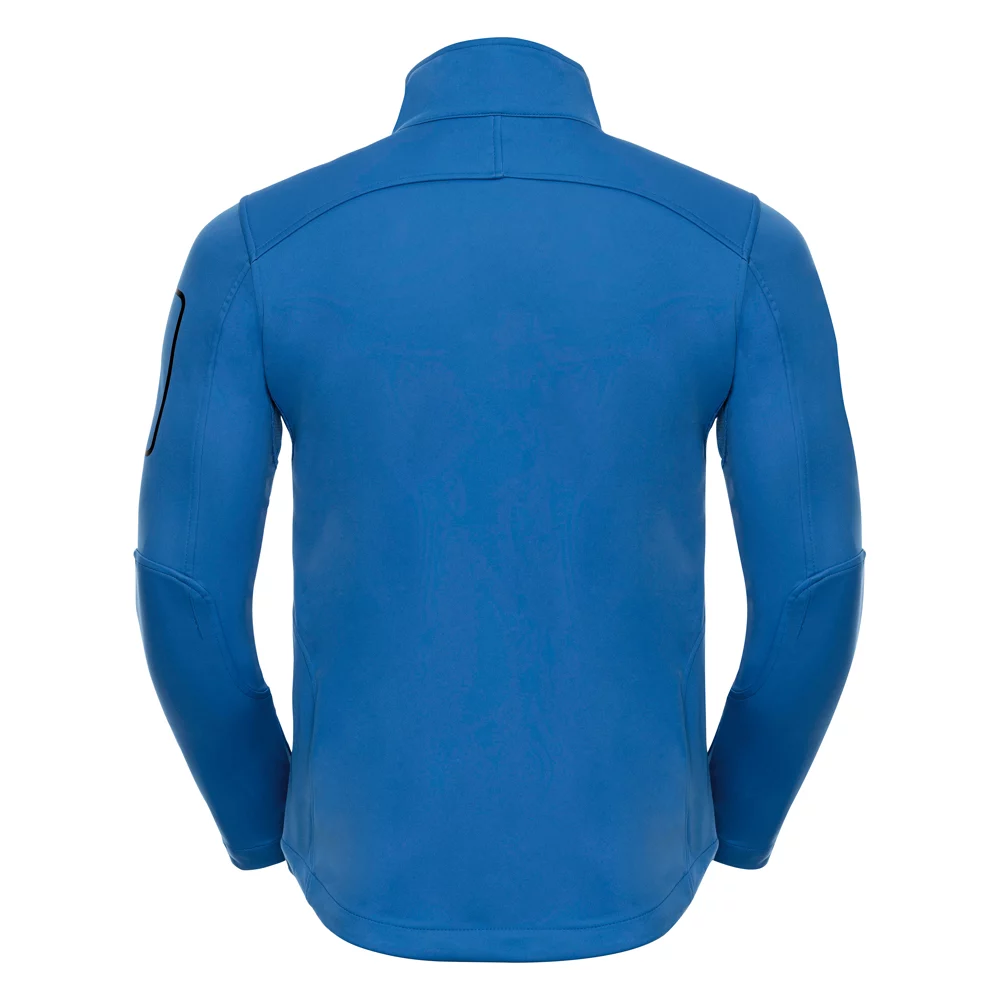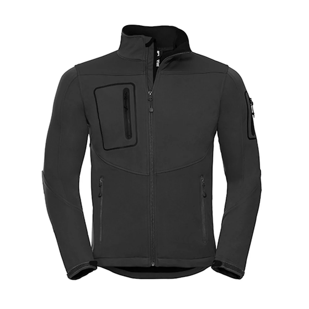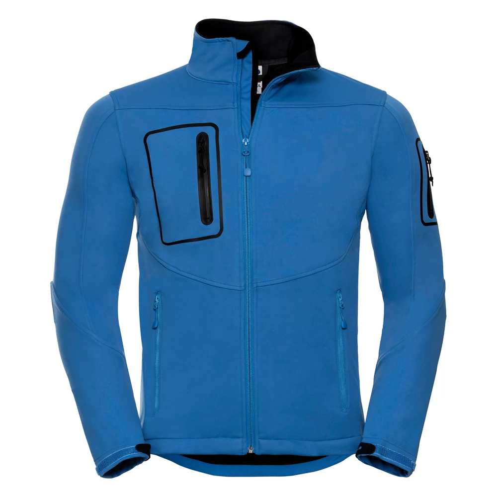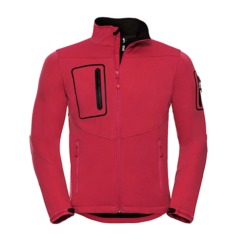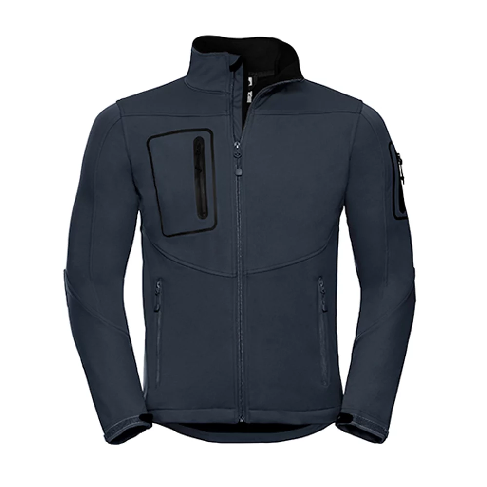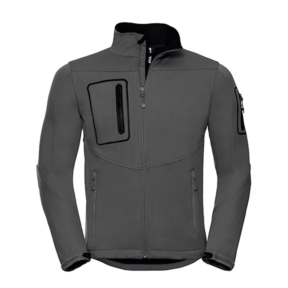 3-Lagen Sportshell Jacke mit vorgeformten Ellbogen, verschweisste lasergeschnittene Taschen, verschweisste hydrophobe Membran.