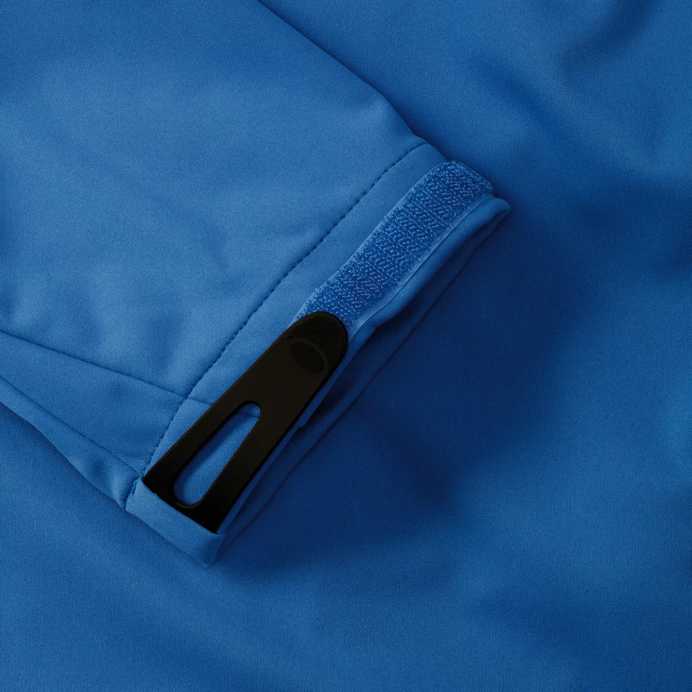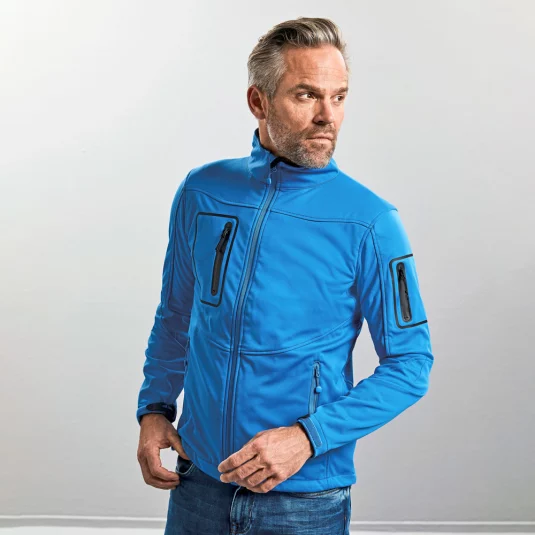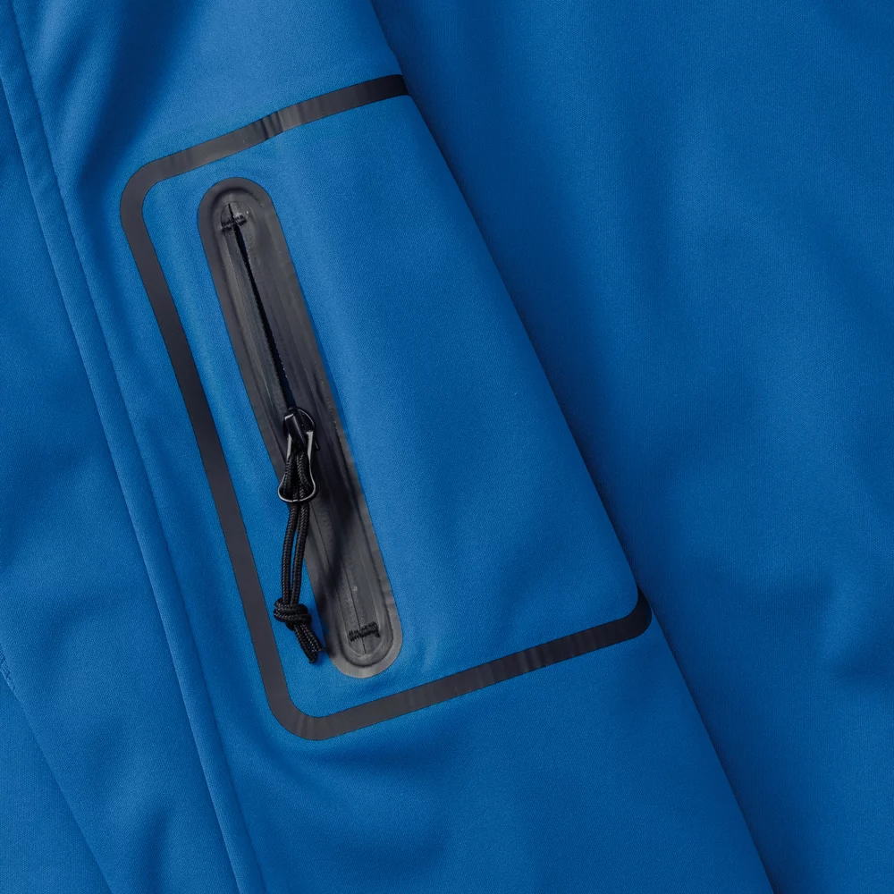 3-Lagen Sportshell Jacke mit vorgeformten Ellbogen, verschweisste lasergeschnittene Taschen, verschweisste hydrophobe Membran. Materialoberfläche mit Abperleffekt, maximale Temperatur- und Feuchtigkeitsregulierung, winddicht. Wasserdicht (5.000mm Wassersäule), atmungsaktiv (5.000g/m² in 24h).