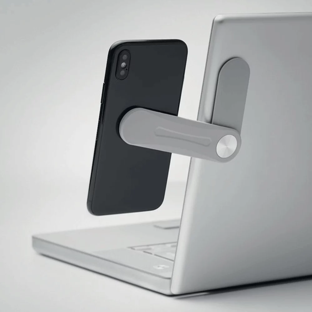 Verstellbarer Smartphone-Halter aus Kunststoff, mit 3M-Aufkleber auf der Rückseite zum Befestigen am Laptop, dank magnetischem Halter hält das Smartphone einfach und stark am Halter