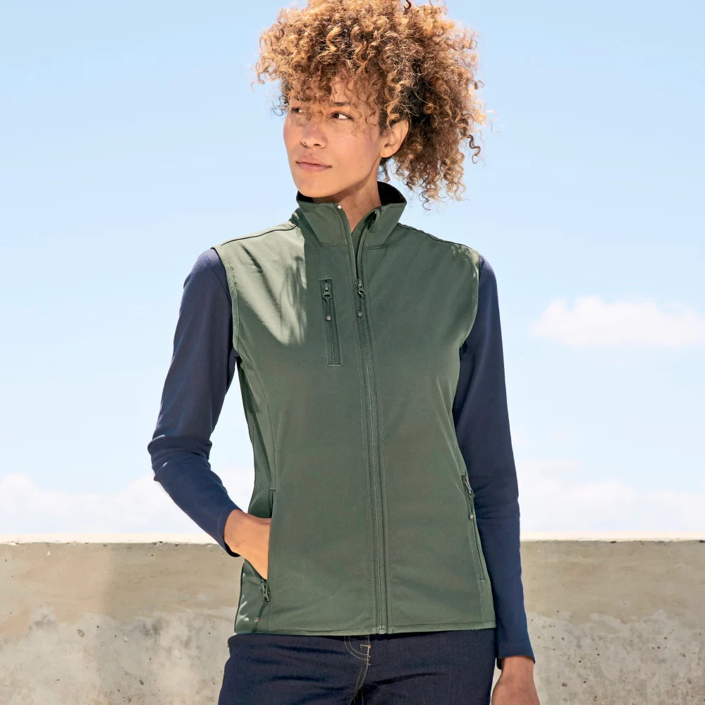 Nachhaltige, 3 - Lagen Softshell-Weste mit zwei seiten Taschen und Brusttasche.