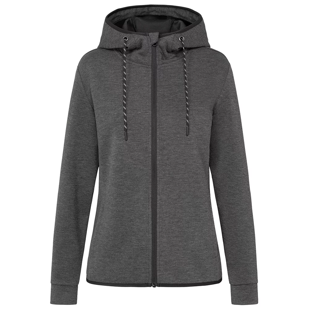 Umweltfreundliche Jacke für Frauen, aus recyceltem Material (8 Plastikflaschen pro Jacke). Reißverschluss mit Metall-Zipper (nickelfrei), Scuba-Kapuze mit elastischer Einfassung und 2-farbigem Kordelzug. Metall-Ösen für Kordelzug (nickelfrei), zwei Seitentaschen mit verdeckten Reissverschlüssen. Elastische Einfassung am Saum und dekorative Flatlock-Nähte. Eigenmaterial-Ärmelabschluss, Nackenband, Seitennähte. Hochwertiges Webetikett im Kragen, abreissbares Pflegeetikett an der Seitennaht.