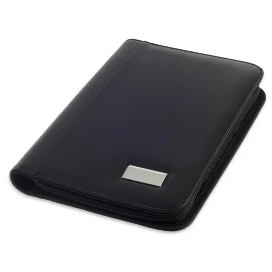 Edle Tagungsmappe aus feinstem Lederimitat, mit Reissverschluss, integriertem Solar-Taschenrechner, Organizer und Metallplakette, wird mit kariertem Block geliefert