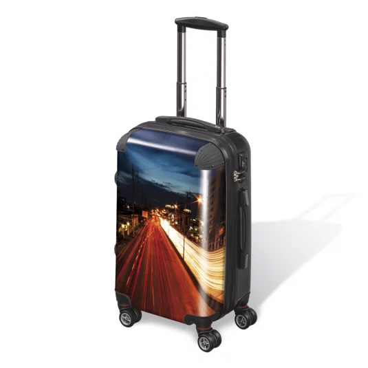 Trendiger Trolley mit 4 Rollen, ausziehbarer Griff, TSA-Schloss, 2 Netzfächer mit Reissverschluss, verstellbare Packriemen, individuell gestaltbares Front-Cover (ganzflächig), bereits ab 20 Stück möglich, auch als grössere Version erhältlich