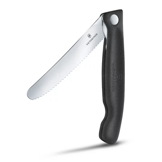 Swiss Made, faltbares, leichtes Küchenmesser mit Wellenschliff, aus rostfreiem Stahl; die Klinge lässt sich gesichert im Griff unterbringen, spülmaschinengeeignet