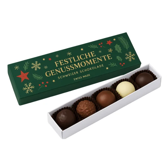 Festliche Genussmomente – Pralinenstange mit 6 klassischen Schweizer Bio-Truffes (ohne Alkohol; 2× Zartbitter, 2× Vollmilch, 2× Weiss), verpackt in einer hochwertigen Kartonbox mit praktischem Schiebedeckel, Haltbarkeit ca.