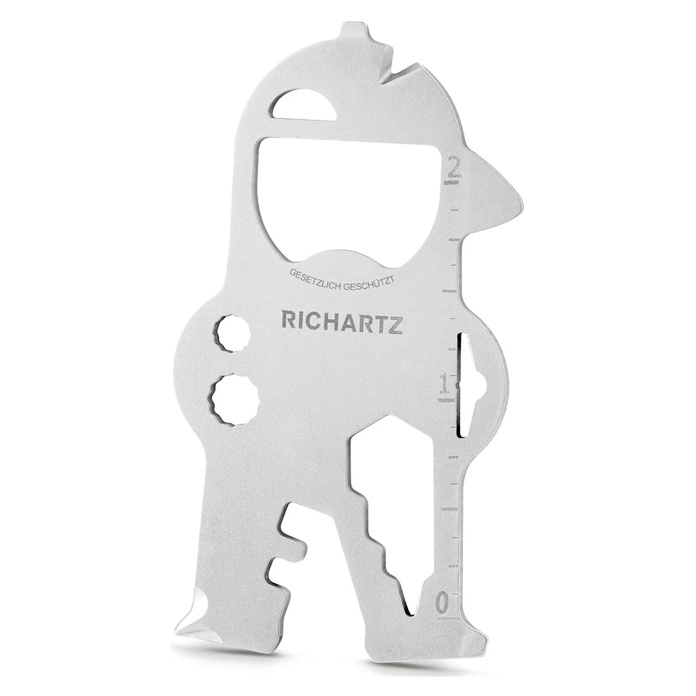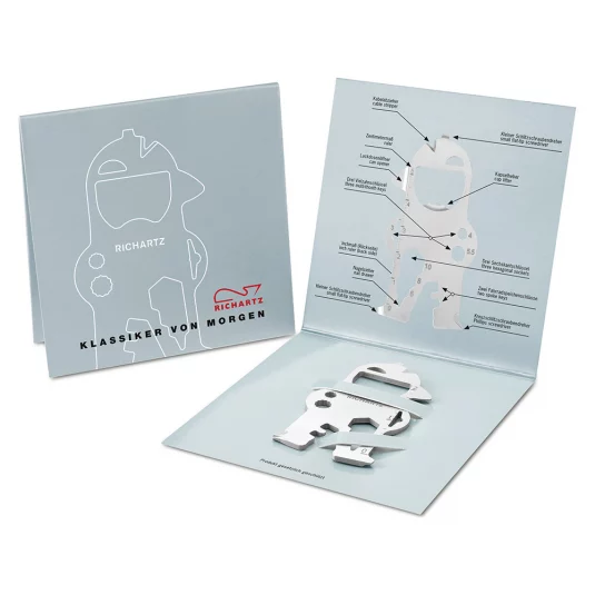 Sympathisches Multifunktionstool aus hochwertigem, matt gestrahltem Edelstahl, mit 17 praktischen Funktionen; Kapselheber, zwei kleine Schlitzschraubendreher, Kreuzschraubendreher, Kabelabzieher, zwei Fahrradspeichenschlüssel, drei Sechskantschlüssel, drei Vielzahnschlüssel, Zentimetermass, Inchmass, Lackdosenöffner, Nagelzieher