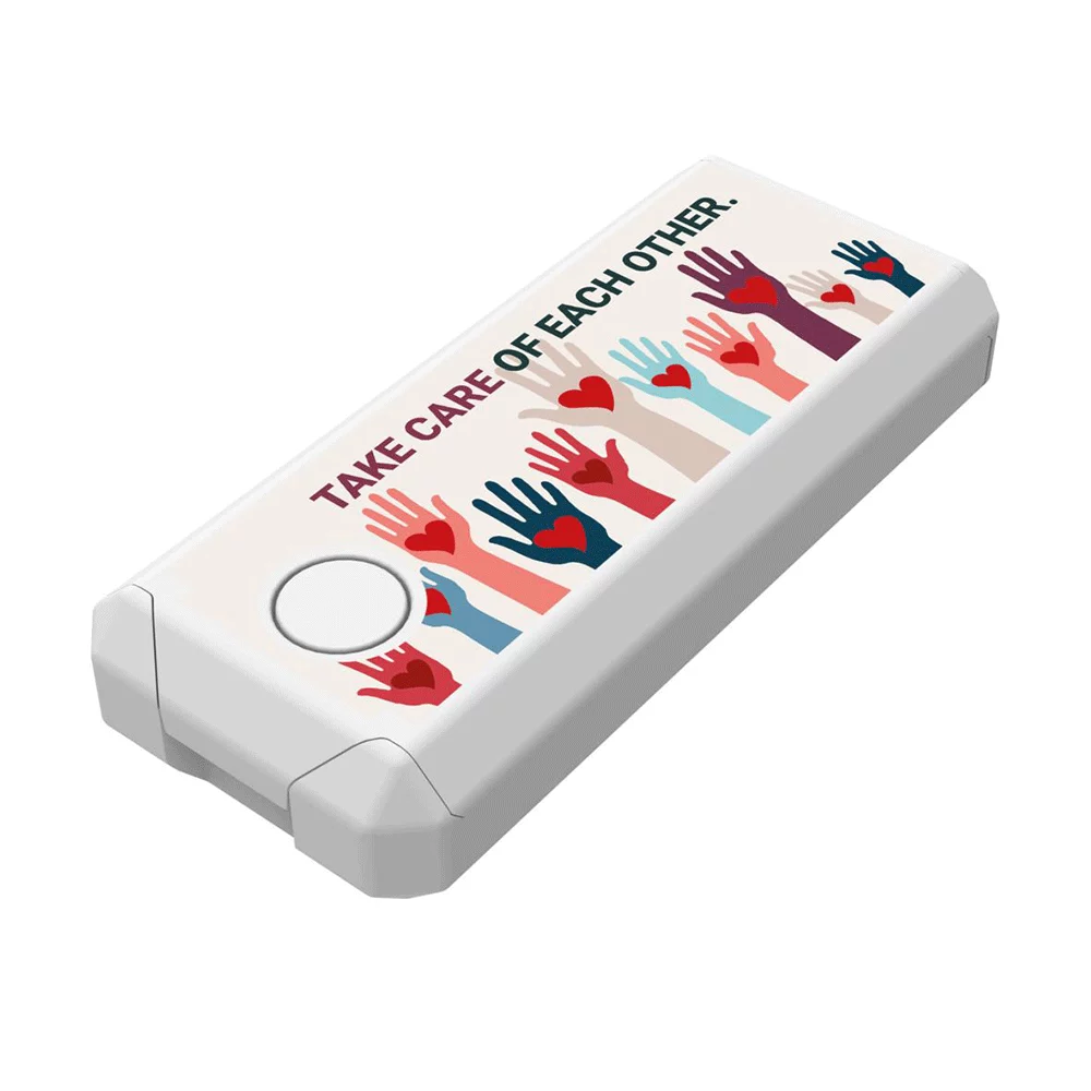 Kunststoffbox mit 5 x 2er Pflaster, lässt sich dank Druckknopf mit nur einer Hand öffnen