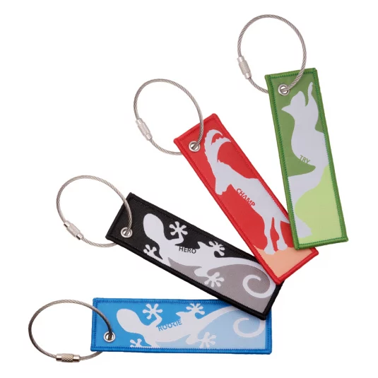 Hochwertige gewebte Schlüsselanhänger, mit vernickeltem Schlüsselring, herstellbar in unterschiedlichen Grössen und mit individuellem Design, Mindestbestellmenge 250 Stück