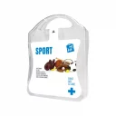 Praktische, kleine Notfall-Box aus gefrostetem Kunststoff, befüllt mit 12 wasserfeste Pflaster, 4 hautreinigende Tupfer, 2 Trockentupfer, 2 Eisgel, 2 Blasenpflaster, 1 elastischer Sportverband
