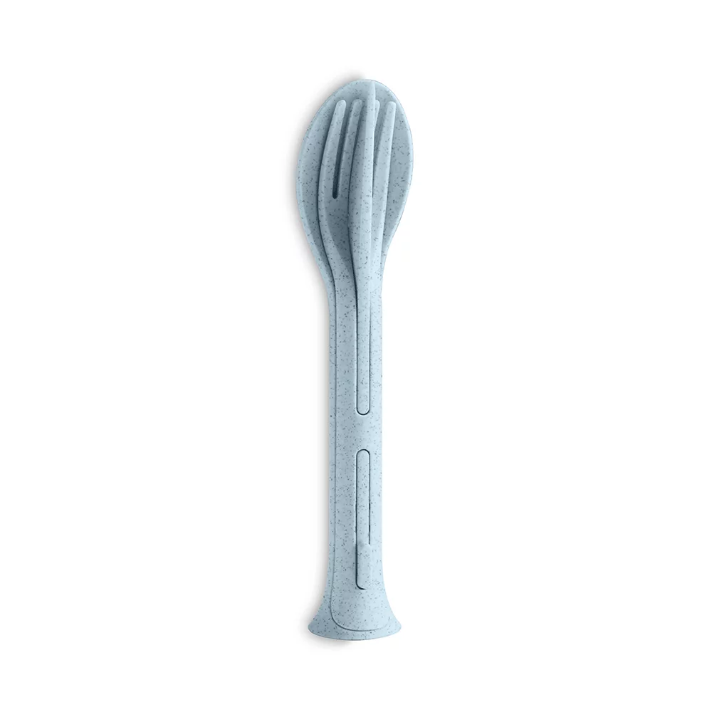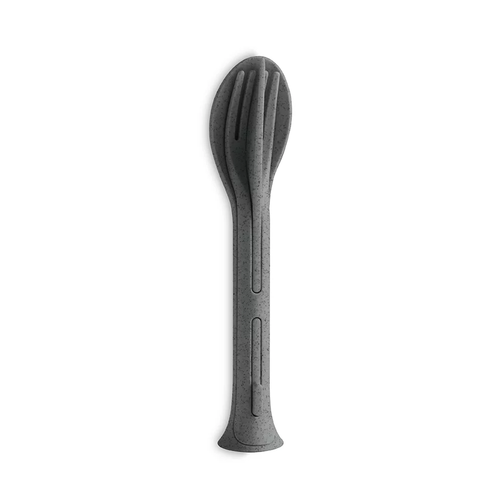 Nachhaltiges To-go-Besteck! 3-teiliges kompaktes und zusammensteckbares Set bestehend aus Löffel, Messer und Gabel, aus thermoplastischem Kunststoff und natürlicher Zellulose, leicht zu öffnen durch cleveres KLIKK-System, lebensmittelecht und spülmaschinenfest