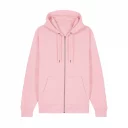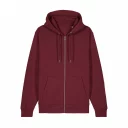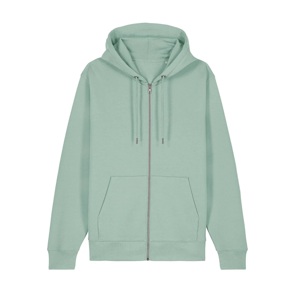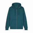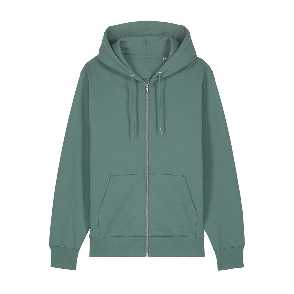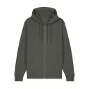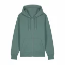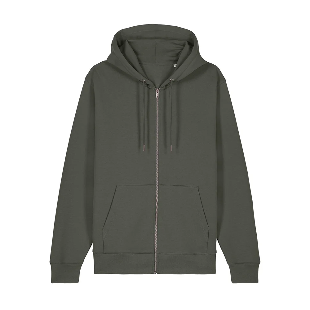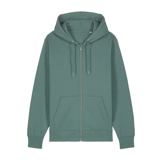 Unisex Hoodie mit Reissverschluss, eingesetzte Ärmel und doppellagiger Kapuze. Runde gleichfarbige Kordel, Kordelenden aus Metall. Nackenband und Reissverschlussinnenseite mit Fischgrätmuster, Ösen und Reissverschluss aus Metall. 1x1 Rippstrick an Ärmelenden und unterem Saum. Kängurutasche mit breiter Doppelabsteppung. Innenseite aufgeraut. Vegan, Fair Wear, Gots und Oekotex-zertifiziert.