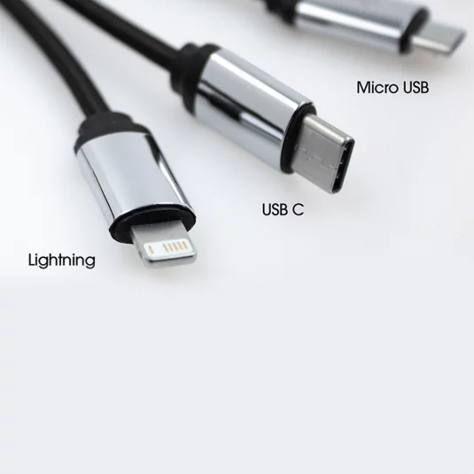 Multi-Ladekabel hergestellt aus rezyklierten Plastikflaschen, mit Körper aus nachhaltigem Bambus und weissem LED-Licht, kompatibel mit allen gängigen Geräten dank Micro-USB, Lightning- und USB-C-Anschluss