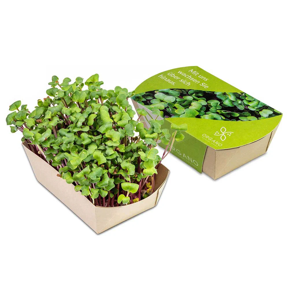Eigenes Gemüse anbauen - frische Vitaminen gewinnen! Hergestellt in Deutschland - umweltfreundliche Schale aus Bambuspapier mit Banderole aus Graspapier, geliefert mit einer Substrattablette als Erde sowie einer Samentüte nach Wahl (Salatrauke, Rettich China Rose, Radies Sango oder Kresse) - zur eigenen Herstellung von schnell wachsenden essbaren Keimpflanzen in Bio-Qualität, welche bereits ab einer Höhe von ca. 10 cm geerntet werden können
