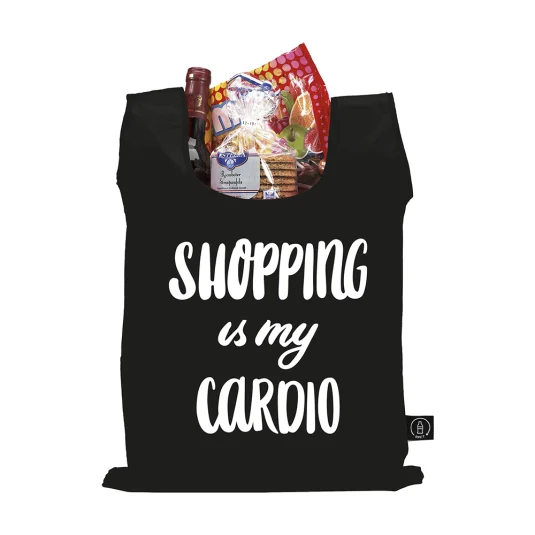 Faltbare Einkaufstasche aus rezyklierten PET-Flaschen (190T-RPET-Polyester), schnell und kompakt verstaubar im integrierten Beutel mit Druckknopf und Karabinerhaken