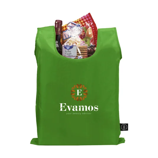 Faltbare Einkaufstasche aus rezyklierten PET-Flaschen (190T-RPET-Polyester), schnell und kompakt verstaubar im integrierten Beutel mit Druckknopf und Karabinerhaken