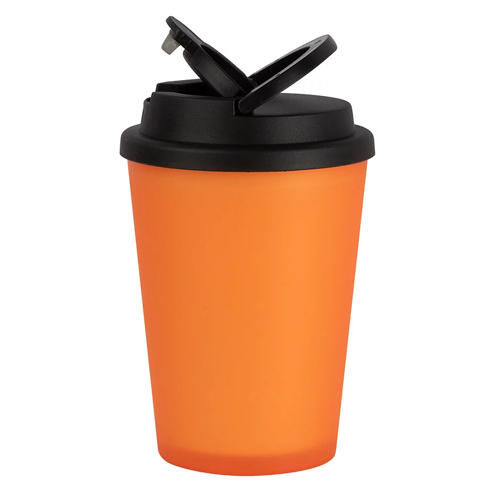 Doppelwandiger Isolierbecher aus Kunststoff (BPA-frei), in matt-transparenter Optik, mit schwarzem Schraubdeckel, auslaufsicherem Trinkverschluss sowie praktischem Henkel, Inhalt 0,35 l, Mindestbestellmenge 500 Stück