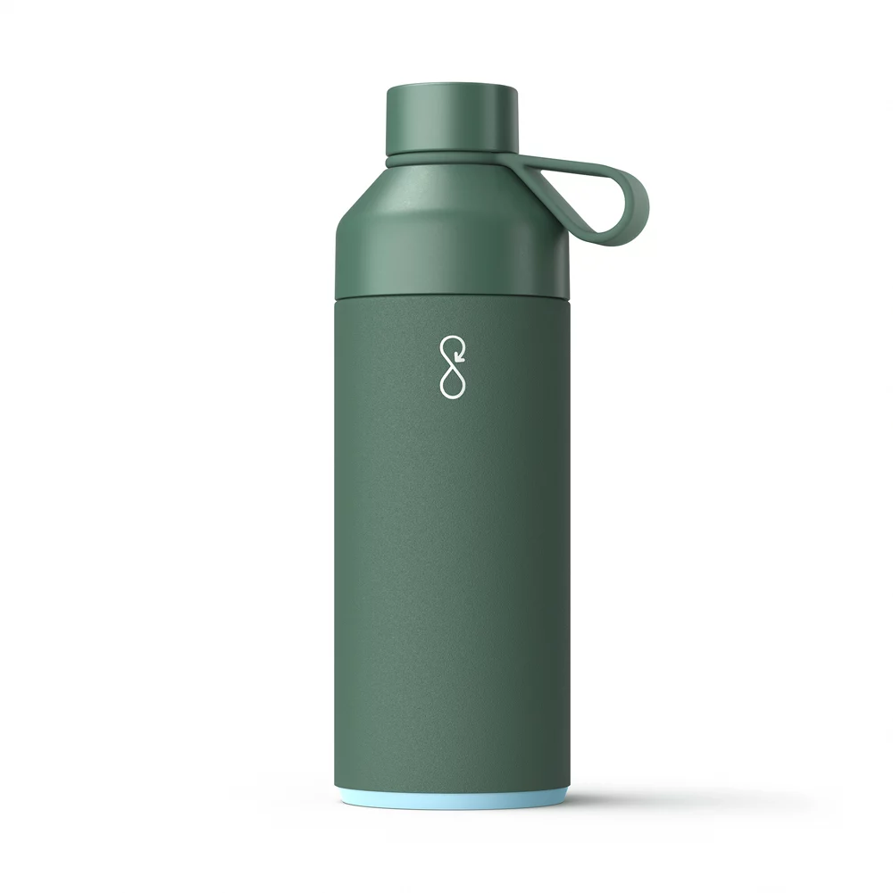 Stop Ocean Plastic! Nachhaltige Trinkflasche aus rostfreiem Edelstahl (65% rezyklierte Materialien inklusive 90% rezykliertem Edelstahl), doppelwandig und vakuum-isoliert, hält Getränke 18 Stunden kalt und bis zu 6 Stunden warm, mit zwei Öffnungen für einfacheres Einfüllen und Auswaschen, auslaufsicher und mit praktischer Trageschleife, 100% spülmaschinengeeignet, geliefert im Einzelkarton (100% rezykliertes Material), Inhalt 1 l